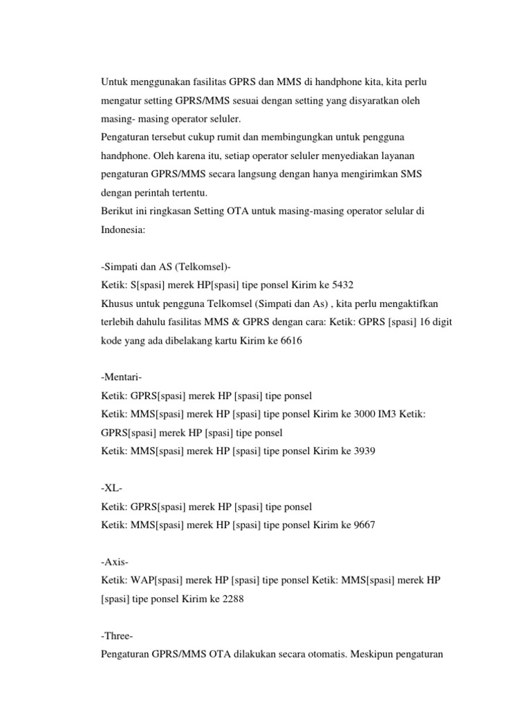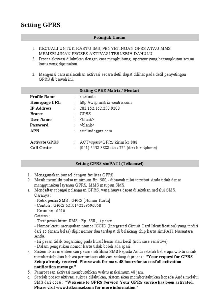 Afaik gprs is for packet data, while sms are part of the gms standard and are therefore not sent via gprs but by using the old gsm system. Indosatgprs homepage url telkomsel (simpati, as, halo) call center: Gprs(spasi)merk hp(spasi)tipe hp kirim ke 9667. Gprsspasiangka dibelakang simcard anda (nomor iccid/integrated circuit card identification) kemudian tunggu beberapa saat, anda akan mendapat sms konfirmasi bahwa aplikasi gprs. Setting gprs manual profile name : Jika keseharian anda dekat dengan aktifitas sms, sebaiknya jangan abaikan paket yang ditawarkan oleh kartu as tersebut. Secara online menggunakan sms atau operator, secara manual menggunakan settingan dibawah telkomsel merupakan operator gsm yang memiliki produk kartu hallo, simpati dan kartu as. Kartu simpati/kartu as kirim sms ke 6616 dengan pesan : Sistem akan memberikan pesan notifikasi sms kepada anda setelah beberapa waktu untuk memberitahukan bahwa permintaan aktivasi sedang diproses : Jawab no 1 dan kirim. Panduan setting gprs,mms,untuk hp sonyericsson dengan mengunakan kartu simpati, xl berikut cara setting gprs/mms untuk hp sony ericsson : 111 (pascabayar) & 116 (prabayar) (dr kartu telkomsel anda). Gprs kartu simpati/kartu as setting ota via sms :